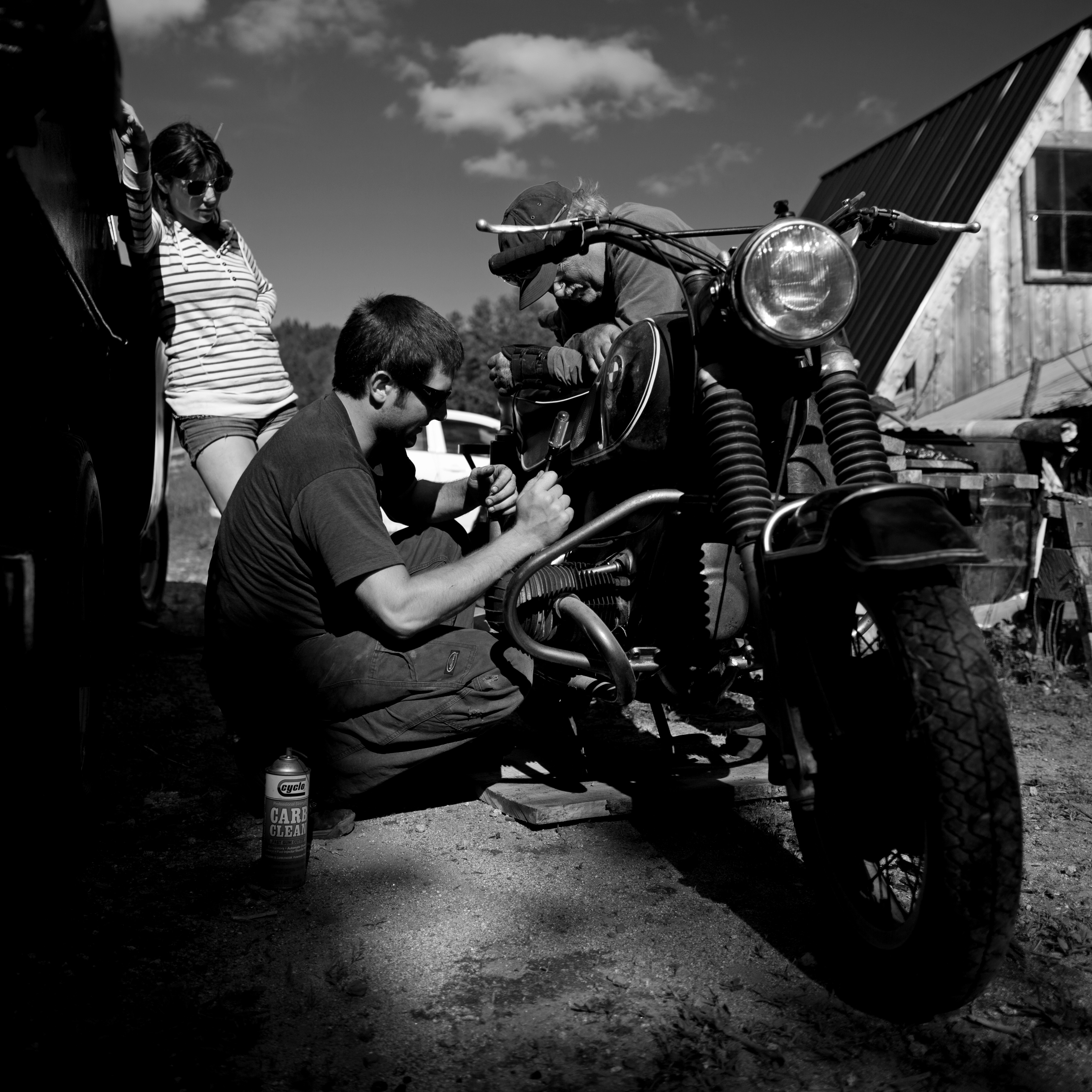 Fixing up the Beamer for a sidecar. Peacham, VT. July 24, 2014.