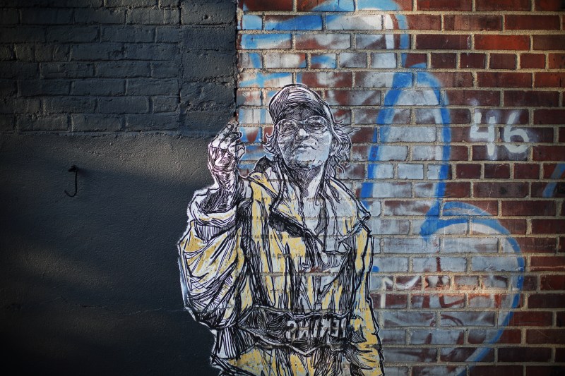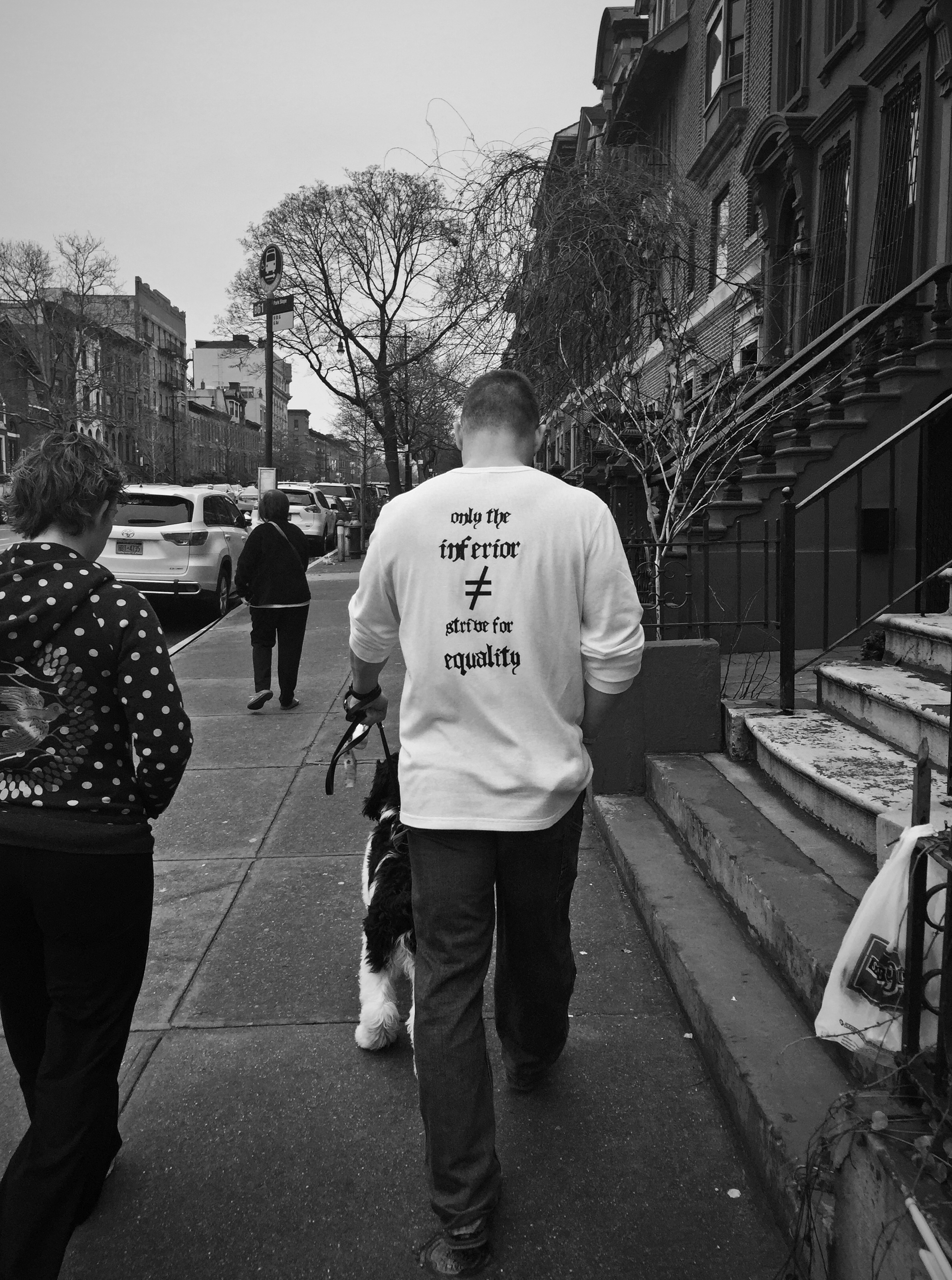 I took this the day after Trump’s inauguration, on a street corner smack in the middle of one of the most progressive, well-educated places in the entire country. It is without question the most transparent expression of pointless hate speech I have ever seen: a white man, walking a dog in affluent Brooklyn, espousing discriminatory fascism (complete with flagrant Nazi overtones) while flanked by a white trash bag and a woman with a dove on her sweatshirt.